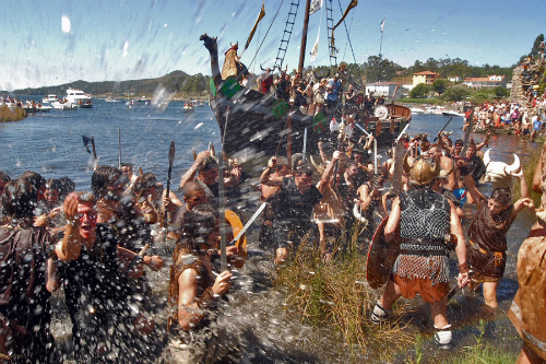 O desembarco, pasado o mediodía, faise nun barco vikingo do século XI, no que os invasores chegan para tomar as Torres: os veciños opoñen resistencia e empeza a loita na que os participantes acaban mollados de viño.