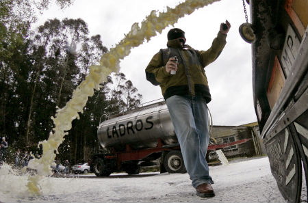 El plazo para que la Xunta se siente con los ganaderos se acaba y empiezan las medidas de presión. Esta mañana, varios grupos de estos trabajadores derramaron cisternas cargadas de leche en Val do Dubra, Bembibre u Ordes, en A Coruña. Los responsables de Ganaderos Unidos aseguran que se tratan de incontrolados, pero adelantaron que iba a correr la leche por toda Galicia, han convocado una manifestación para hoy a las 11 en Santiago y ya han advertido que el suministro va a bajar.