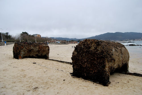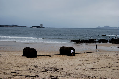 Parte de una batea apareció esta mañana en la playa de Samil después de que la marea la arrastrase, previsiblemente desde el otro lado de la ría, durante la noche. Según ha sabido vigoalminuto, los dos flotadores, se habrían soltado de los ‘muertos’ a causa del fuerte oleaje de ayer y el mar los habría arrastrado, unidos por el mismo madero.