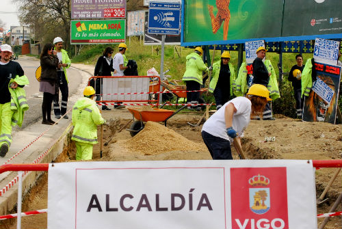 Para escenificar el comienzo de las obras delante de los medios de comunicación, que habían sido citados a las 12 del mediodía, se hizo venir a una cuadrilla de 10 obreros que llegaron a una zanja delimitada y vallada. El grupo apareció pasada esa hora al sitio señalizado con un cartel que ponía ‘Alcaldía de Vigo’, descargó los aperos y empezó a rastrillar y quitar algunas piedras; doce minutos más tarde, llegó el alcalde, quien estuvo hablando con los técnicos durante seis minutos, antes de atender a los periodistas durante 17. Una vez que hubo terminado, se montó en el coche y se fue.