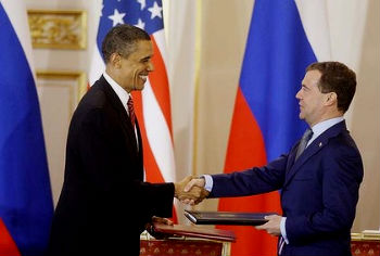 El mundo es más seguro…concretamente unas 500 cabezas nucleares más seguro. Los presidentes de Estados Unidos y Rusia firmaron hoy en Praga un acuerdo que levará a la reduccion de sus respectivos arsenales atómicos hasta 2017, cuando es posible que Obama afronte el final de su segundo mandato en la Casa Blanca. Él y Dimitri Medvedev, sellaron un pacto, que renueva el START I de tiempos de George Bush, padre, por supuesto, que compromete a ambas potencias a reducir en un 30 % estas armas. Ello significa que se reducen las ojivas operacionales desplegadas a 1.550, frente a las 2.200 contempladas en el Tratado de Moscú firmado hace 8 años, y limita a 800 el total de lanzaderas, la mitad de las permitidas bajo el START I, acuerdo que venció hace tres meses.