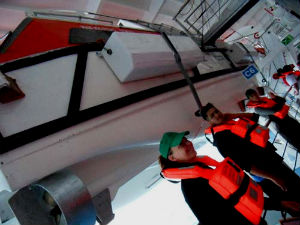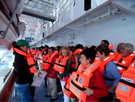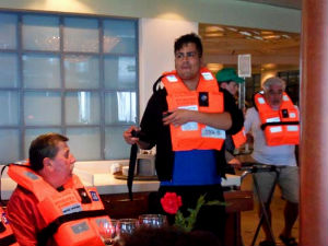 Simulacro-chaleco/Tresyuno ComunicaciónSimulacro-botes/Tresyuno ComunicaciónPrimer paso: no tener vergüenza. En cuanto suenan los siete pitidos, señal internacional de alarma, con un chaleco naranja enorme colgado del cuello tienes que acudir a la cubierta 5 a junto el personal del trsatlántico que te guiará hasta los botes salvavidas. Ordenados por sectores, lo principal es esperar a reunir a todos los miembros del grupo para no dejarse a nadie atrás.