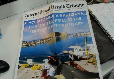International Herald TribuneVestidos de calamar, hipocampos y mejillones, varios miembros de Ecologistas en Acción y Ocean 2010 repartieron en la Porta do Sol, coincidiendo con la presencia de los ministros de Pesca de las UE, ejemplares de una edición especial del ‘International Herald Tribune’, con una en la que se recogen las demandas de la sociedad europea en relación con el mantenimiento de los recursos pesqueros.