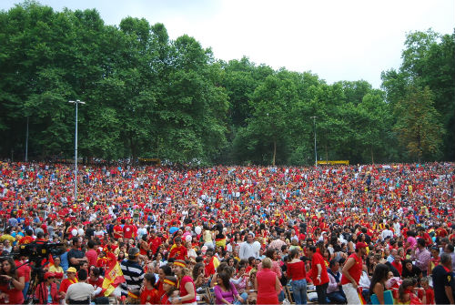 Había peña. «Asi es como se organizan las cosas» aseguró el alcalde a vigoalminuto delante de un auditorio de Castrelos que se quedó pequeño para los miles de vigueses que querían apoyar hoy a las Selección. Más de 25.000 personas, 20.000 en las gradas y 5.000 en la parte cercana al escenario se desplazaron hasta el parque donde el Concello había instalado una macropantalla de 40 metros cuadrados. Unidades de Protección Civil movilizadas desde primera hora de la tarde, controles en los accesos y cientos de personas esperando a que se abrieran las puertas,l completaban un cuadro que era, al 99,99% de color rojo, el otro 0,1% era un holandés que llegó vestido íntegramente de naranja, barba y pelo incluidos.
