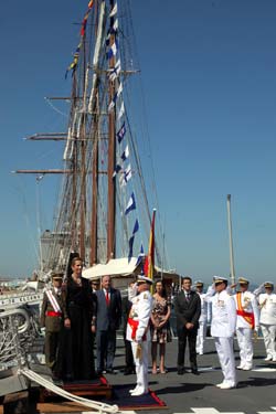 La fragata Méndez Núñez más que una madrina de lujo, tiene una madrina de sangre azul. En un recinto acotado en el Muelle de Trasatlánticos ante la atenta mirada de más de 250 personas y la expectación de espontáneos fuera del recinto, la Infanta Elena entregó a la Méndez Núñez la bandera de combate que los buques izaban antes de entrar en guerra. Un estandarte «que ya no se usará porque lo del barco de un país contra el barco del otro ya no se lleva», pero que servirá para representar a España «por todos los mares del mundo».