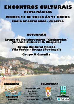 Esta noite vai a ser máxica nos areais de Chapela. O Colectivo Berete organiza a partir das 22 horas un festival na praia de Arealonga no que o que sobrará é a boa música tradicional. Pola area pasarán o grupo de pandereteiras ‘Cacharelas’, o grupo portugués Raizes e o grupo A Quenlla. Estás invitado!
