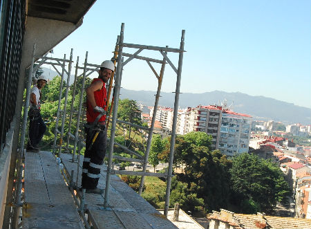 Sí alguien estaba sufriendo los rigores del calor era el agente de la Policía Local de Guardia en el control de entrada a la Xefatura, allí el termómetro subió hasta los 35º, y en el exterior del Concello, donde varios obreros están acabando de instalar un andamio desde el que se reformará toda la fachada. También comprobamos que en la mayoría de las oficinas se han instalado ventiladores y que se habían abierto las ventanas y las puertas principales para hacer corriente.