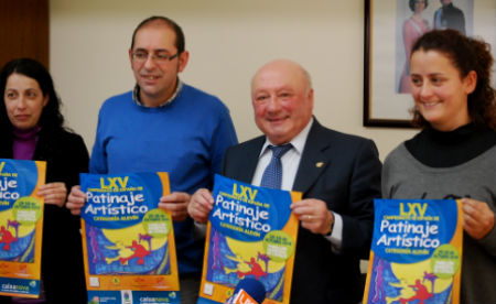 José Costa, alcalde de Covelo, acompañado de membros do clube local e organizadores, sostén o cartel oficial do Campionato de España de Patinaxe Artística, hoxe na presentación do mesmo