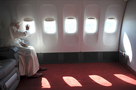 El Santo Padre despegó rumbo a Compostela a las 8 y media de la mañana desde el Aeropuerto Internacional Leonardo da Vinci en un avión de ‘Alitalia’ que sobrevolará Italia y Francia a cuyos jefes de estado Benedicto XVI mandará sendos telegramas.