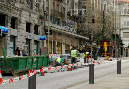 Ahora se está cambiando la parte de la derecha de la calzada (dirección Porta do Sol), lo que ha obligado a cortar uno de los carriles, inutilizar el semáforo del paso de cebra y colocar uno de obra para que sólo da paso a los coches, pero no a los peatones. Los obreros están picando piedra y sustituyendo, por quinta vez el firme que en otras partes se ve levantado.