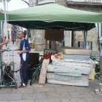 Ya casi no hay comida en el campamento de la farola de Urzáiz, aunque todavía se puede haber alguna bebida que otra. Lo gordo ya está en la Praza do Rei. Una de las acampadas de la explanada del Concello no dudó en darle un vasito de leche a una niña que iba de la mano con su padre. (fotos de la recogida de colchones de los alrededores de la farola, del puesto de comida y del padre y su hija esperando un vaso de leche abajo)