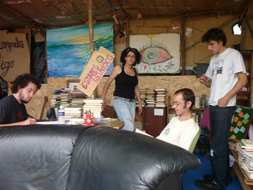 RUTH VILLAR/ Al igual que el 15M de Sol y el de Barcelona, el 15M vigués también condena los actos violentos registrados ayer en el Parlament catalán. Los indignados de Vigo están más que hartos de que «algunos radicales» aprovechen las protestas sociales del movimiento que, subrayan, siguen siendo pacíficas para «colarse» y armarla. «No nos hacen ningún favor«, señala una de las acampadas mientras coloca un buen número de libros en unas estanterías.