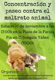 Los amantes de los animales y todos aquellos que estén en contra del maltrato animal, tienen una cita este sábado a las 5 de la tarde en la Farola de Urzáiz. Sus organizadores destacan que, todos los meses se lleva a cabo un evento contra esta lacra y que este “haremos una concentración y paseo contra las administraciones que utilizan servicios privados de recogida de animales, en especial contra la macroperrera de Armenteira”. En esta ocasión se ha escogido Príncipe porque es una de las calles más transitadas de la ciudad, “aún más un sábado por la tarde”.