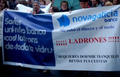 En el trayecto, los afectados han empapelado las sucursales de Novagalicia Banco con carteles en los que se leía “’Luto por ver un país lleno de ladrones y corruptos’, tiraron huevos contra las cristaleras o fueron en comitiva fúnebre, con ataúd incluido.