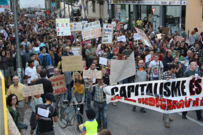 Esta acción, llevada a cabo este miércoles por la tarde en un edificio que los vecinos denominan La Embarazada por su forma circular y que está situado en la calle Sant Feliu de Codines de la capital catalana, se enmarca en las protestas que ha convocado el movimiento 15-M para conmemorar el segundo aniversario de su nacimiento.