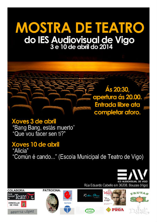 Arranca la 1ª Mostra de Teatro del IES Audiovisual de Vigo (Bouzas). Las funciones ejecutadas por los estudiantes de Producción y Realización se realizarán el jueves 3 de abril y el 10 del mismo mes, en el centro de estudios.