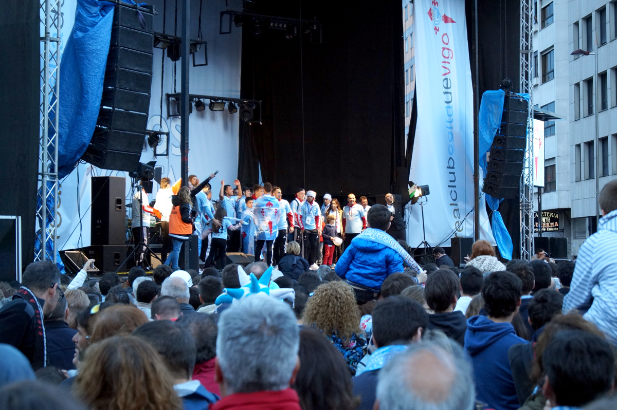Con muchas ganas de fiesta subieron al escenario también los jugadores y el cuerpo técnico, que quisieron agradecer a la afición su respaldo y brindarles los triunfos. Hugo Mallo e Iago Aspas quisieron acordarse de «los del norte» y comenzaron a dedicarle unas canciones al Deportivo de A Coruña que continuaron cantando a capela los aficionados. También demostraron que tienen dotes fuera del campo: Nolito se puso al piano para amenizar gran parte de la celebración e incluso le dedicó la canción del Cola Cao a Pape Cheikh y ‘Chelo’ Díaz se puso a rapear junto a Guidetti, que demostró que la música también es lo suyo. Mientras, Drazic anunciaba a los aficionados en un español chapurreado que «para la semana, fiesta».