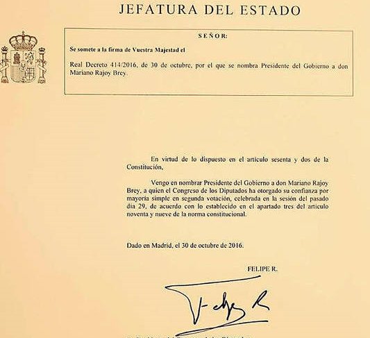 El Jefe del Estado ha sancionado el Decreto de Nombramiento de Mariano Rajoy como presidente del Gobierno, después de que fuera investido este sábado en el Congreso de los Diputados.