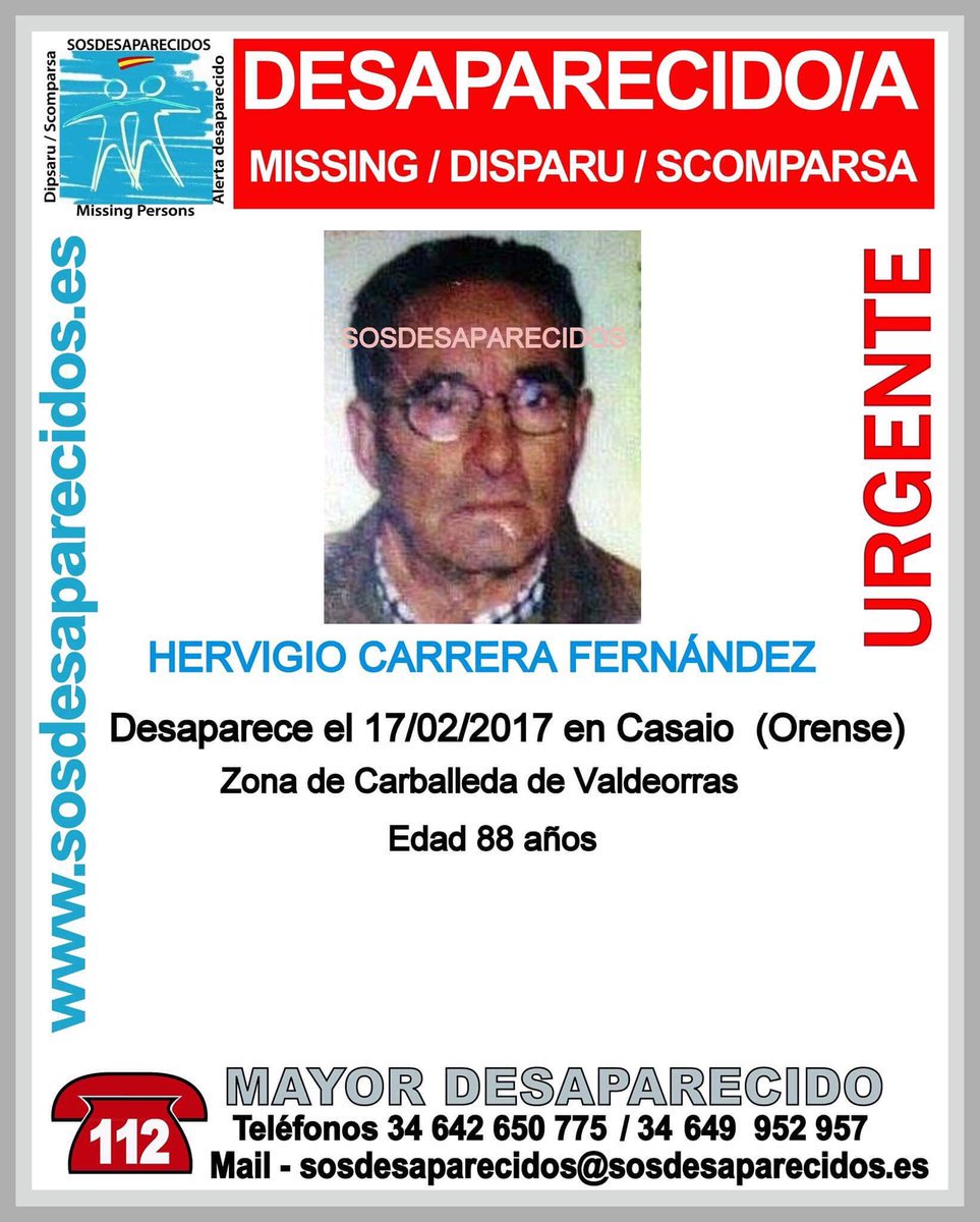Decenas de personas buscan a Hervigio Carrera Fernández, de 88 años, que ha desaparecido de su casa. El operativo que intenta localizar a este anciano, vecino de Carballeda de Valdeorras, en Ourense, se ha visto incrementado por un helicóptero de la Guardia Civil, un equipo de montaña y la unidad canina.