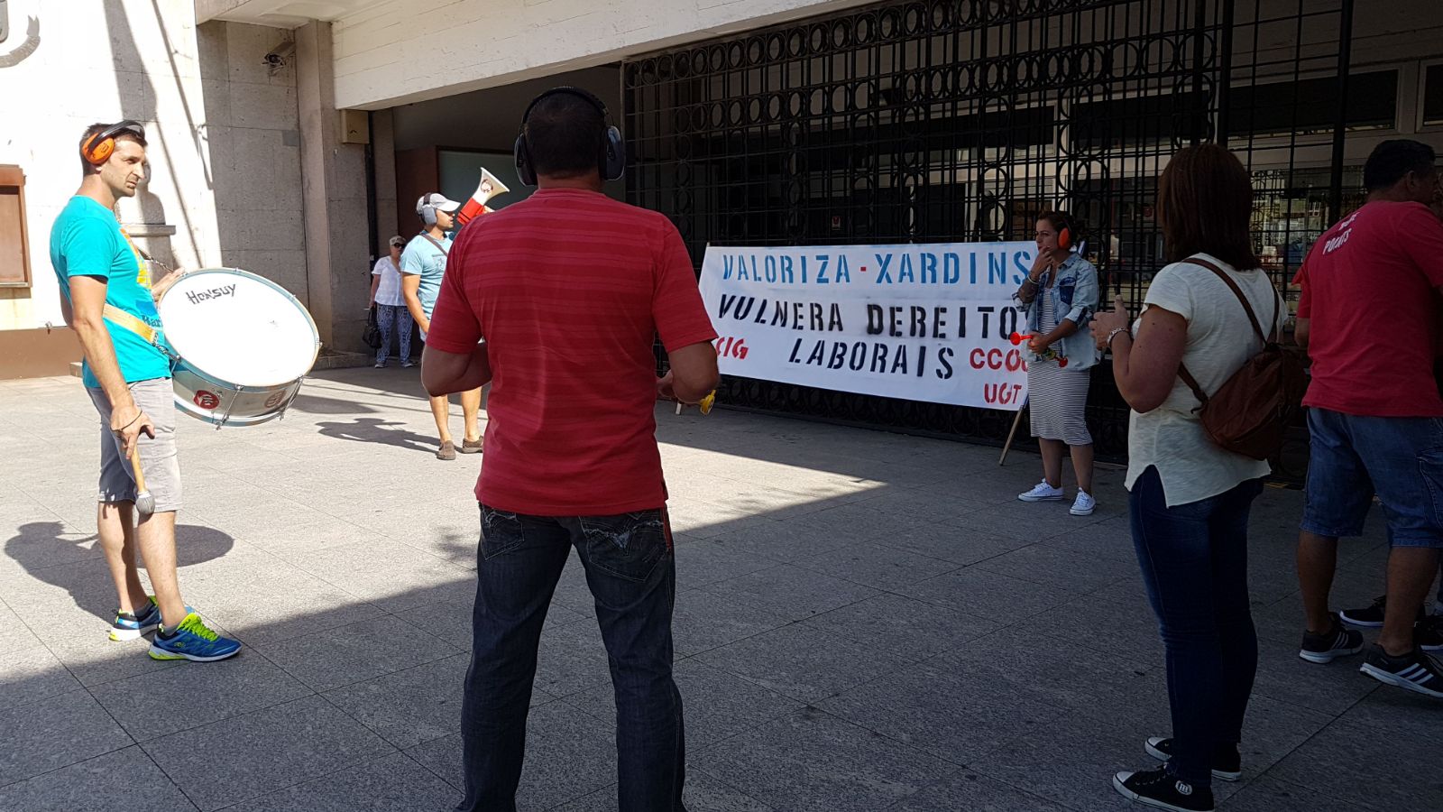 As protestas tiveron lugar mentres se celebraba o Pleno do Concello: parte dos traballadores amosaron uns cartaces nos que podía lerse ‘Menos horas extras, máis contratación’, e outra parte protestaba no Praza do Rei, á entrada do Concello.