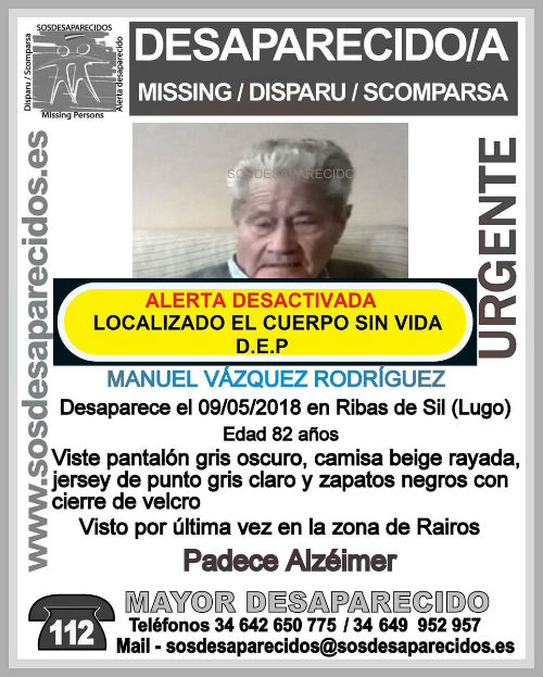 El cuerpo sin vida de Manuel Vázquez Rodríguez, de 82 años, que había faltaba de su casa en el concello lucense de Ribas de Sil desde el pasado día 9, fue encontrado este pasado miércoles, como ha confirmado SOS Desaparecidos.