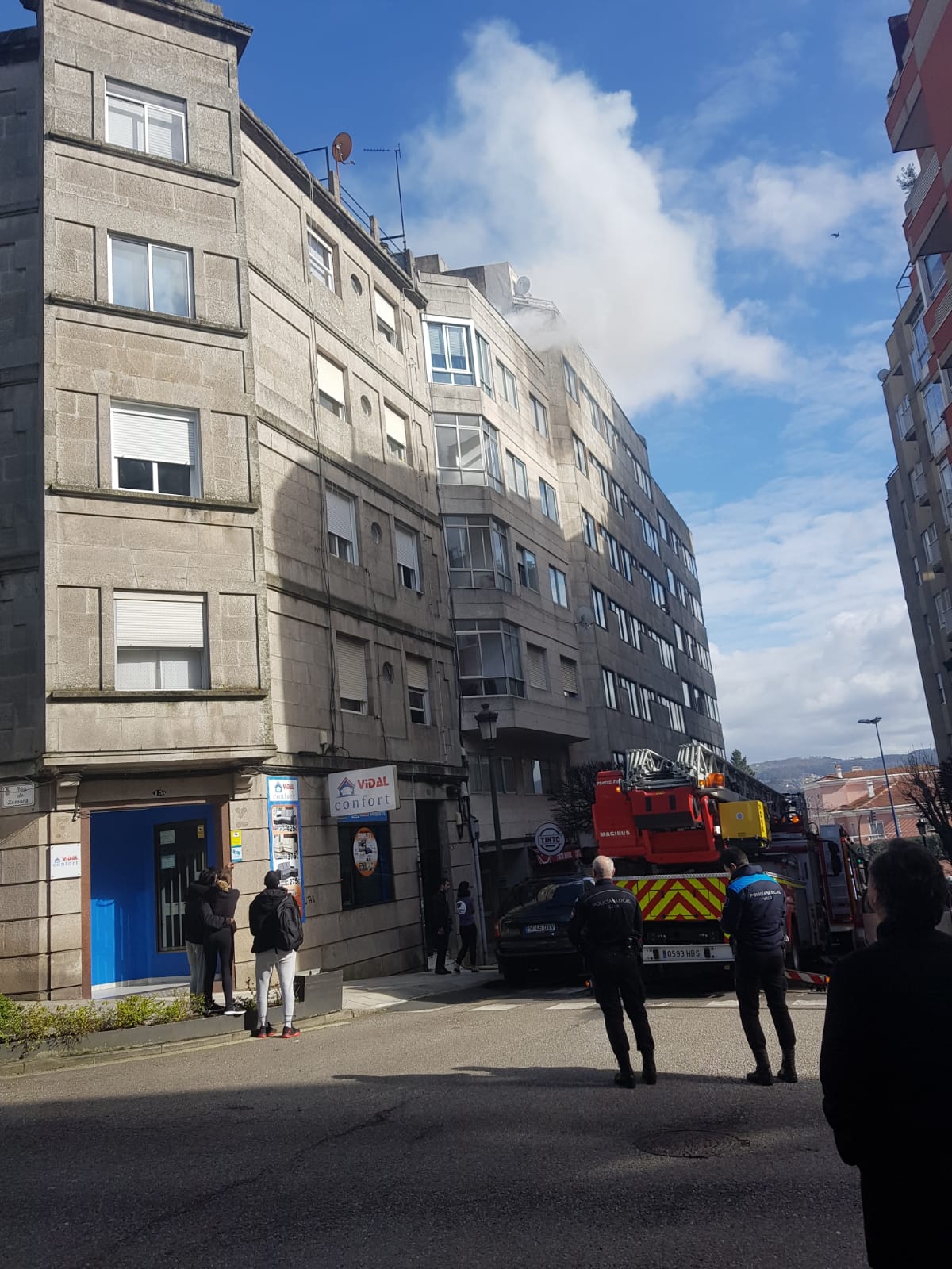 Bomberos de Vigo han acudido este miércoles a un incendio que se ha declarado, poco antes de las 4 de la tarde en un edificio de la rúa Ramon y Cajal, cerca de la Praza de España.