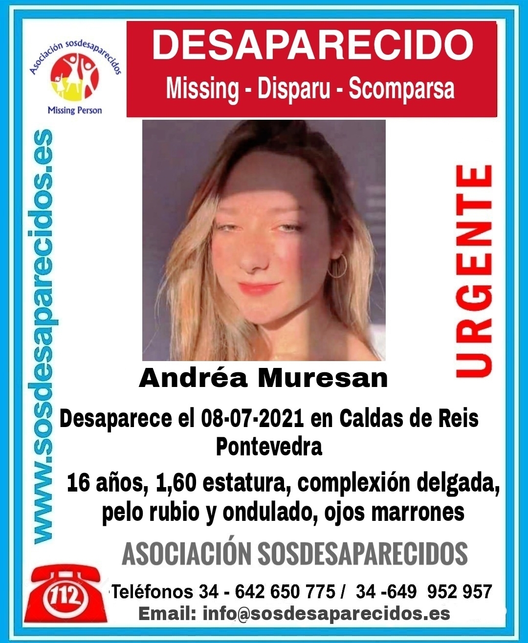 La Guardia Civil pide ayuda para intentar localizar a una joven de 16 años que falta de si casa en Caldas de Reis desde el pasado 8 de julio. Andréa Muresán tiene 16 años de edad, mide 1,60 metros de estatura, es de complexión delgada, tiene el pelo rubio ondulado y ojos marrones.