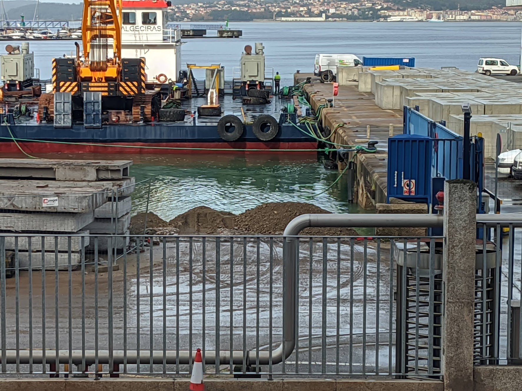 Imaxe: @VigoVindeiro/ Ecoloxistas en Acción denuncia a «inxustificada actuación» da Autoridade Portuaria de Vigo no pantalán número 2 da dársena de Bouzas-Berbés. Un novo recheo que ocupará 8.300 m2 de lámina de auga e que prexudicará seriamente á rexeneración natural do mar, afectando á pesca e marisqueo, ademais do seu impacto visual.