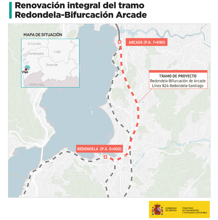 El Ministerio de Transportes y Movilidad Sostenible ha iniciado el procedimiento de expropiación de los terrenos necesarios para ejecutar las obras de renovación integral del tramo Redondela – Bifurcación Arcade, incluido en la línea de ancho convencional Redondela – Santiago de Compostela, en los municipios de Redondela y Soutomaior.