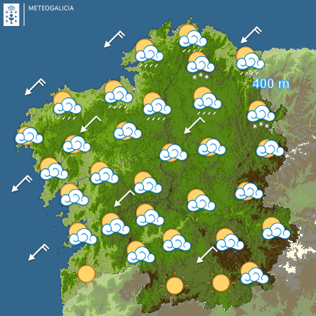 O martes, teremos un día de ceo parcialmente nubrado con chuvia intermitente no terzo norte pola mañá e cota de neve nos 500 metros. Pola tarde seguirán dominando as nubes e con apertura de claros nas provincias de Lugo e Ourense. Pola noite agardamos a chegada dunha nova fronte con precipitacións polo oeste. O vento soprará frouxo de dirección variable co paso das horas e sendo do sur ao final do día.