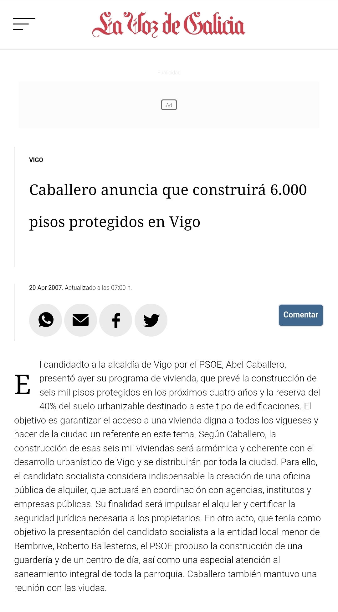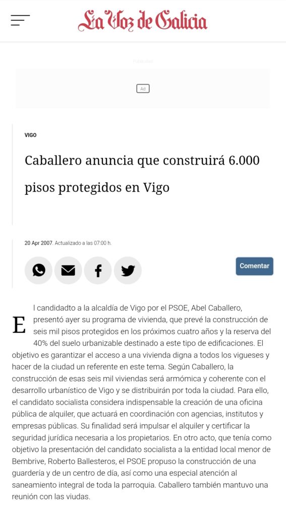 Sin embargo, el discurso vuelve a chocar con un dato clave del pasado reciente: el propio Abel Caballero incluyó en su programa electoral de 2007 el compromiso de construir 6.000 viviendas de protección oficial tras acceder a la Alcaldía. Dieciocho años después, esa promesa sigue lejos de cumplirse y la política municipal de vivienda ha avanzado a un ritmo muy inferior al anunciado entonces, con largos periodos sin promociones públicas significativas impulsadas directamente desde el Concello.