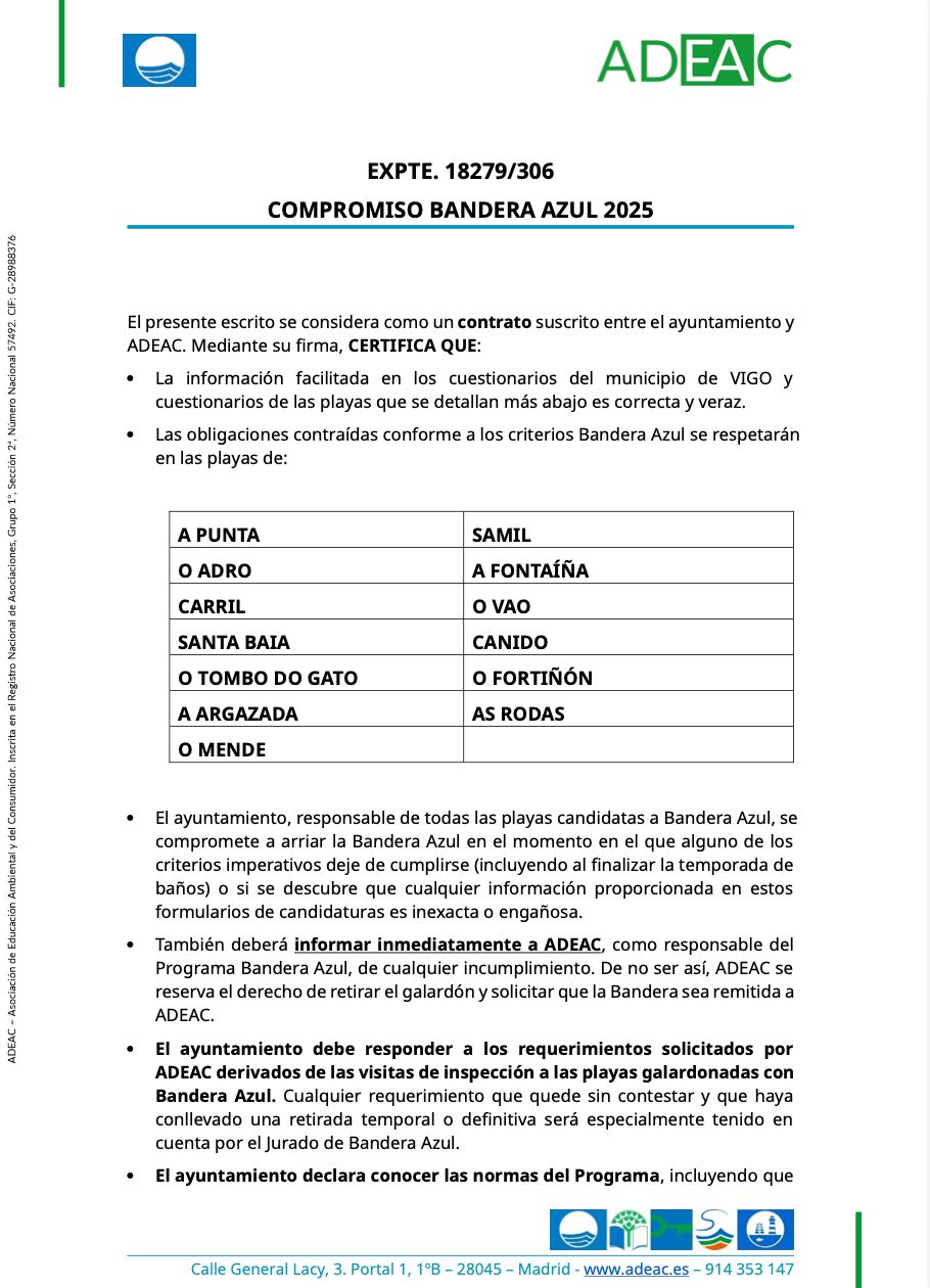 Pero, pese a su insistencia de que se izará esa bandera en Samil, la realidad es que el Concello no ha optado a ella, sino que ha pedido esa protección para A Punta, Argazada, A Fontaiña, Carril, Canido, O Adro, Fortiñón, O Mende, O Vao, Tombo do Gato, Rodas y Santa Baia. Una relación en la que no figura la denominación ‘Samil derecha’.