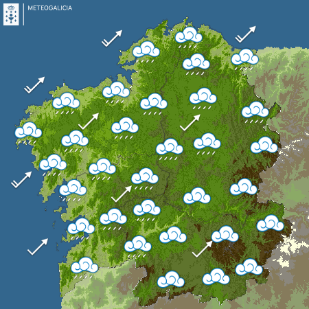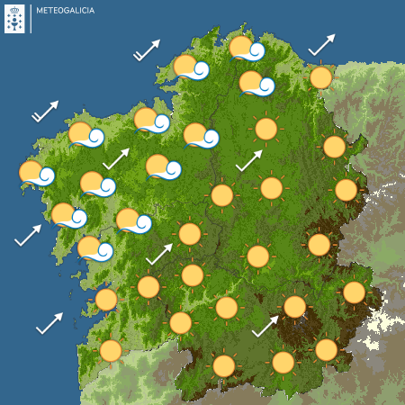El viento soplará del sudoeste flojo aumentando de intensidad en el litoral noroeste por la noche. Las temperaturas mínimas sufrirán un ligero descenso mientras que las máximas ascenderán ligeramente hasta los 21 grados de Ourense; 20 de Lugo; 18 de Santiago, Pontevedra y Vigo-aquí con 8 de mínima-; 17 de Ferrol y 16 de A Coruña.