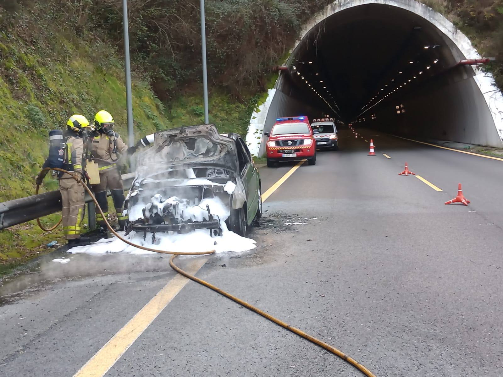 El aviso llegó al 112 Galicia en torno a las 15:50 horas. Fue uno de los ocupantes del vehículo quien alertó de que el turismo estaba ardiendo cuando circulaba por el tramo final del túnel.