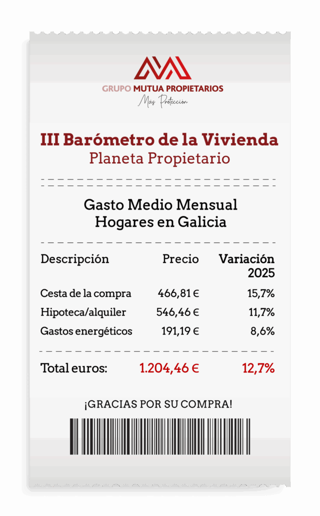 La presión de los gastos básicos del hogar continúa aumentando en Galicia. Según el III Barómetro ‘Planeta Propietario’, elaborado por el grupo Mutua Propietarios, el 25 % de los gallegos reconoce tener dificultades para asumir los costes esenciales de vivienda, alimentación y suministros.