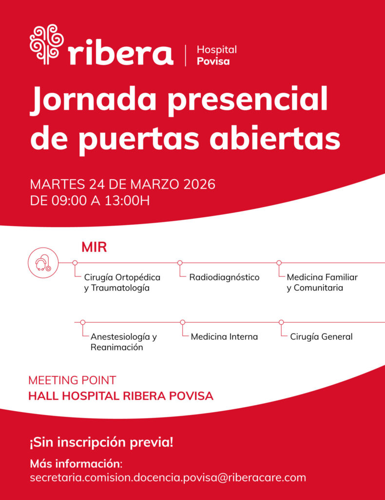 La jornada permitirá conocer cómo es la formación MIR en el Hospital Ribera Povisa, visitar los servicios asistenciales y resolver dudas directamente con la Secretaría de la Comisión de Docencia. El centro ha optado por un formato flexible: no será necesaria inscripción previa para participar en la visita.