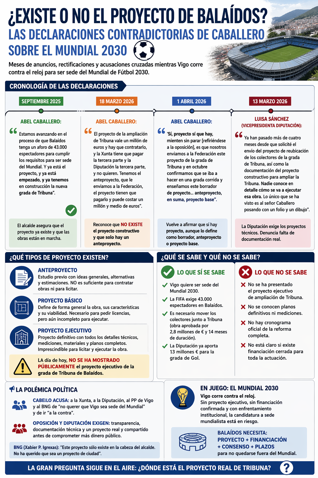 Asimismo, ha reclamado a Caballero una “hoja de ruta clara” para garantizar que Vigo pueda cumplir los plazos exigidos para aspirar a ser sede del Mundial 2030, incluyendo la ampliación de Balaídos, la mejora de campos de entrenamiento y la planificación de infraestructuras de movilidad y aparcamiento.