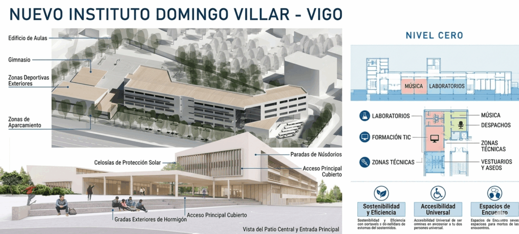 El futuro instituto será el primero diseñado íntegramente bajo los criterios del denominado Plan de nueva arquitectura pedagógica de la Xunta, un modelo que apuesta por espacios más abiertos, versátiles y adaptados a nuevas metodologías docentes.