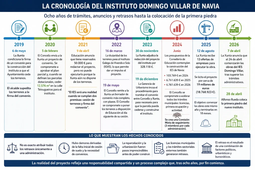 La previsión trasladada por el Gobierno gallego es que las obras concluyan en 21 meses, lo que situaría la apertura del instituto en enero de 2028, siempre que se cumplan los plazos previstos.