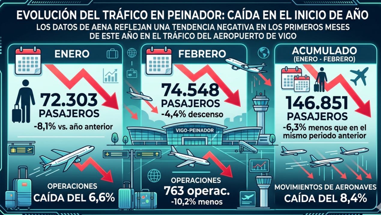 - En el acumulado de los dos primeros meses del año, Peinador suma 146.851 pasajeros, un 6,3% menos que en el mismo periodo del año anterior, junto a una caída del 8,4% en movimientos de aeronaves.
